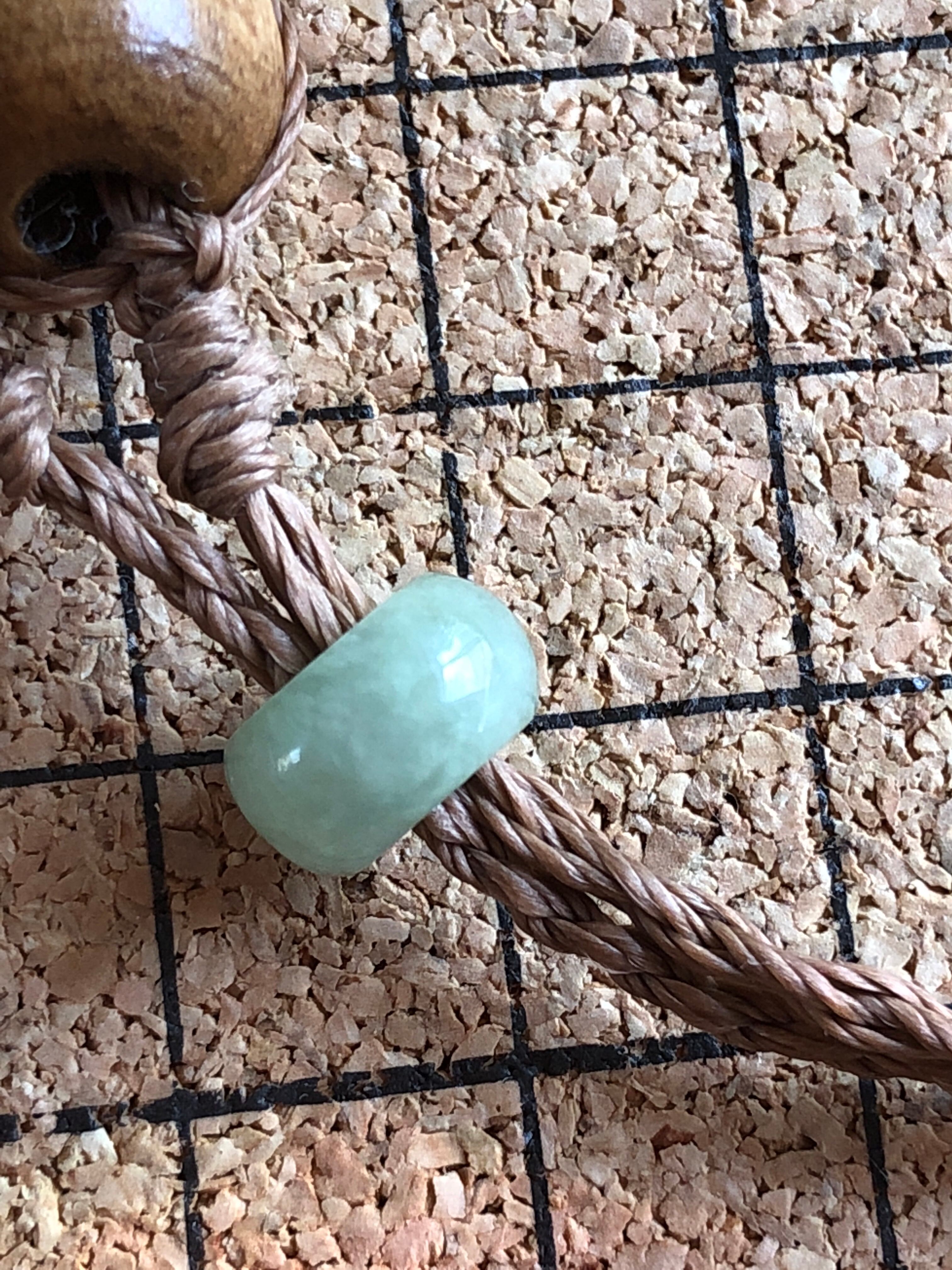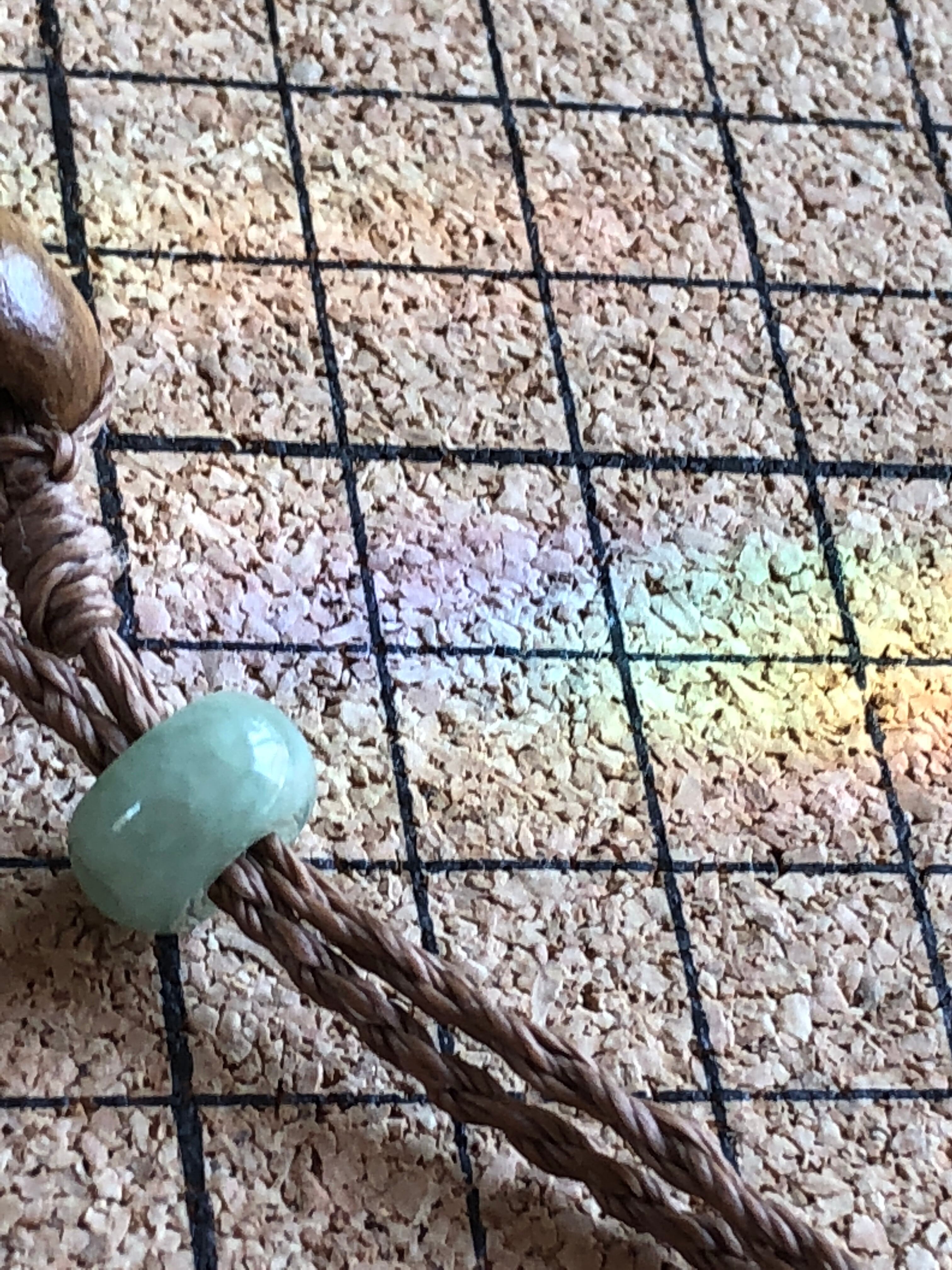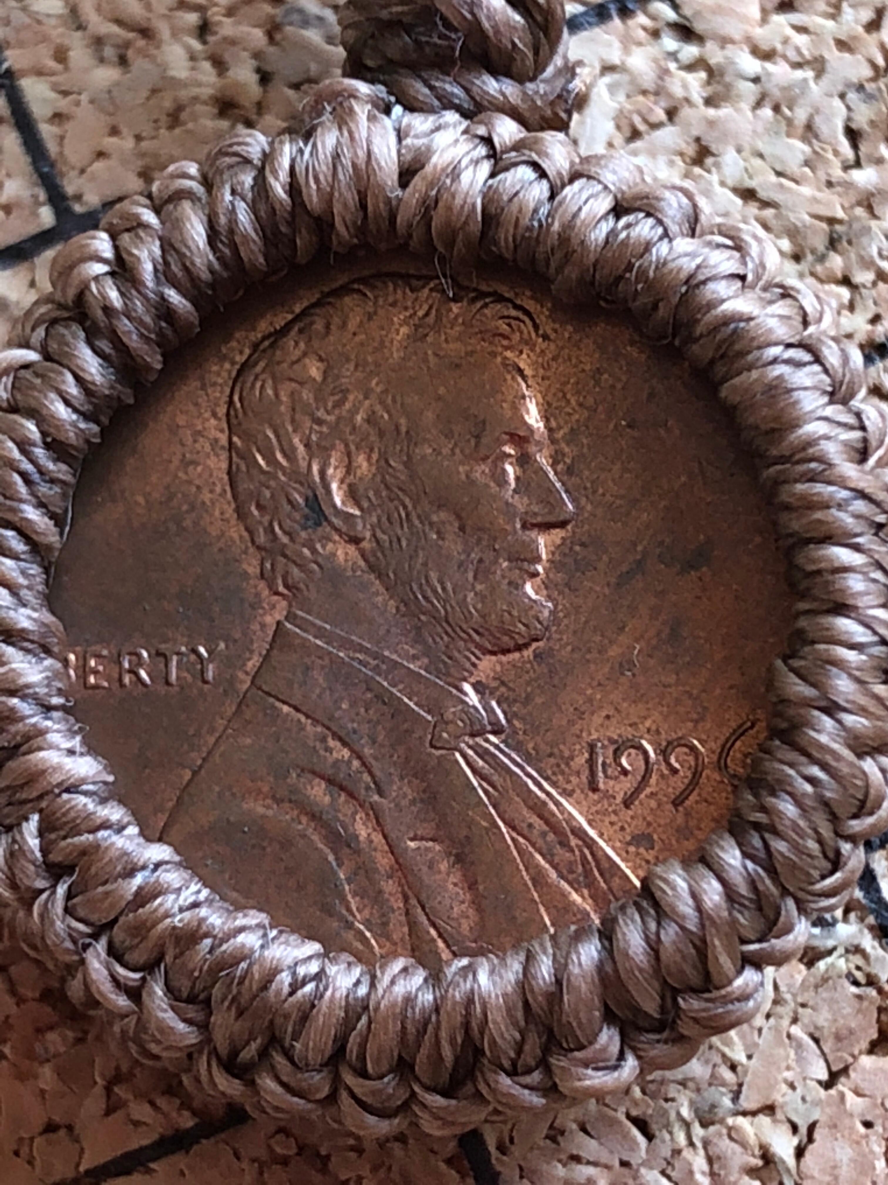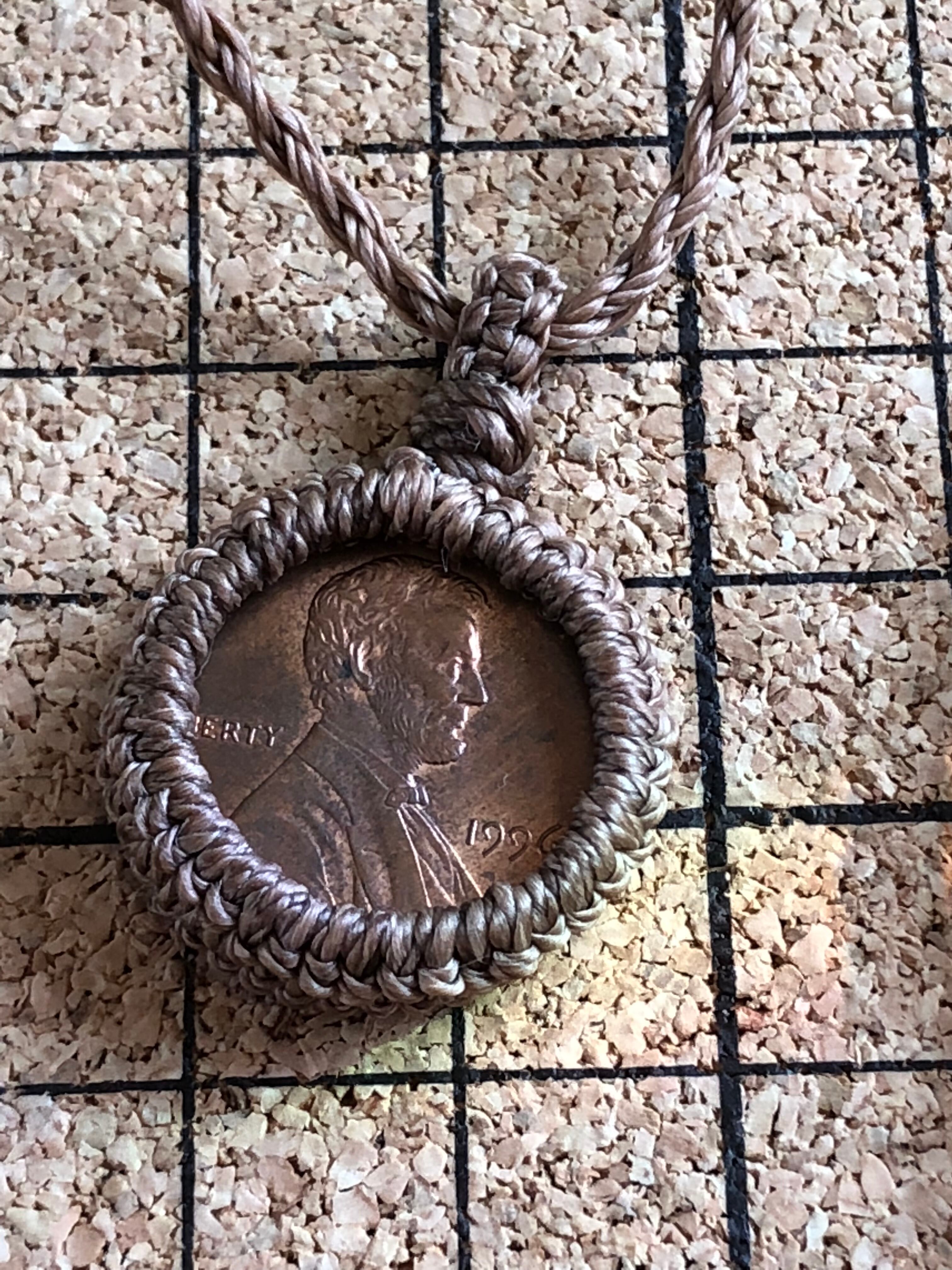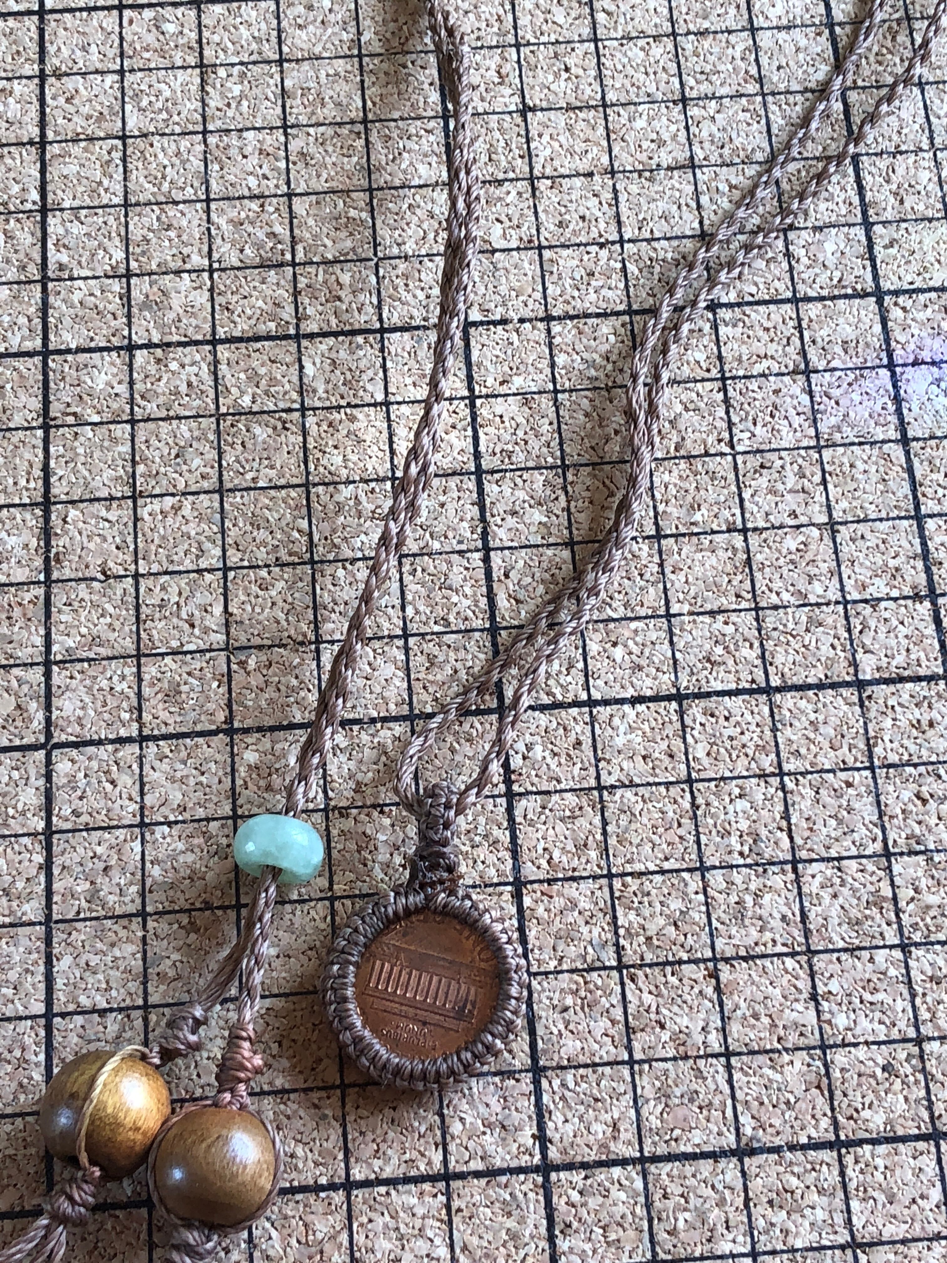 アメリカコインでマクラメ編みのネックレスを作りました。留め具部分の緑色の石は糸魚川翡翠を使用しています。